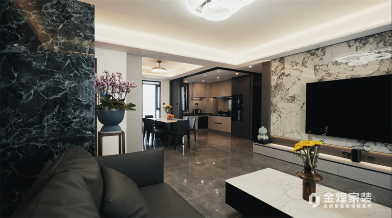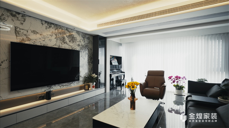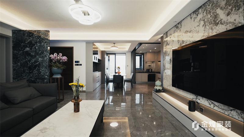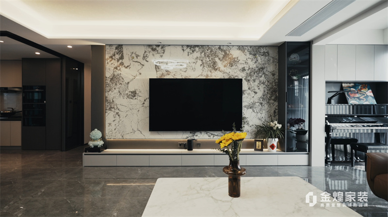 電視背景墻的大理石紋理、簡潔的家具線條以及精心布置的燈光設計,都體現(xiàn)了現(xiàn)代輕奢風格的特點。同時,通過添加一些鮮花和裝飾品,增加了空間的溫馨感和生活氣息。