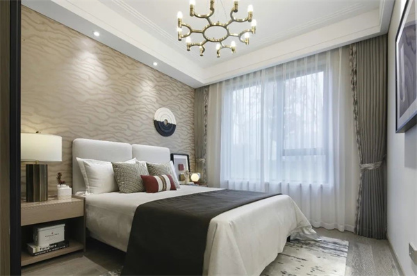 傳統(tǒng)的中式元素與現(xiàn)代的簡約設(shè)計完美結(jié)合,呈現(xiàn)出典雅與舒適的空間氛圍。床頭背景設(shè)計了一幅大型藝術(shù)背景裝飾,為整個房間增添了一份藝術(shù)氣息。大窗戶讓自然光線充盈房間,這樣的主臥空間,不僅是休憩的港灣,更是文化與現(xiàn)代生活的完美融合。
