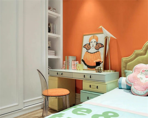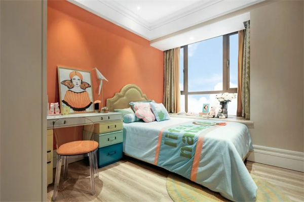 兒童房充滿溫馨與活力,設計簡潔卻極具趣味性。房間的主色調(diào)以橙色為主,配合原木色地板,營造出輕松愉快的氛圍。一側(cè)設置了一張書桌,陽臺明亮的光線灑入室內(nèi),為孩子提供了理想的學習和游戲區(qū)域,增添了童趣和活力。