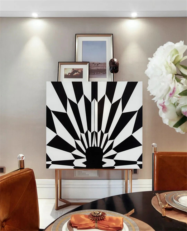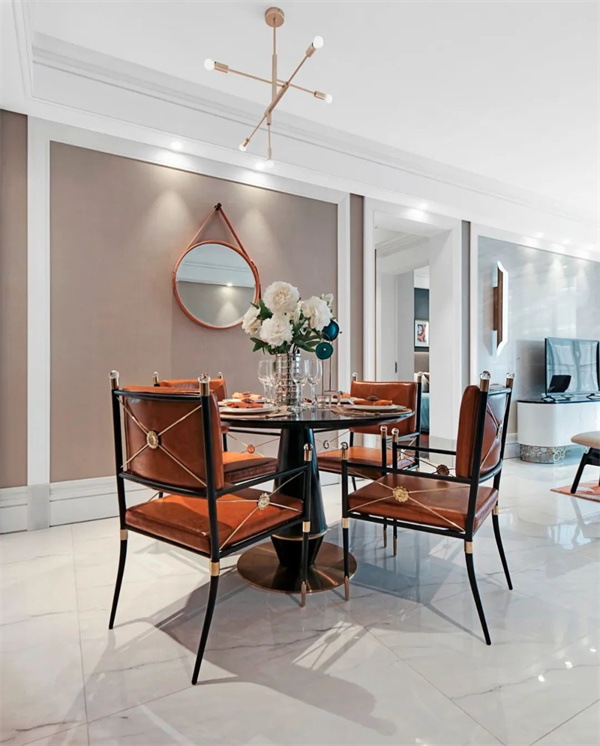 餐廳設計講究細節(jié)與品質(zhì)的融合。中央的餐桌簡潔大氣,圍繞它擺放著幾張極具辨識度的愛馬仕橙色餐椅,與同色系的裝飾品相互呼應,為餐廳增添了一絲活力和時尚感。餐桌上精致的餐具與花藝裝飾,為每一餐的時光都賦予滿滿的儀式感。