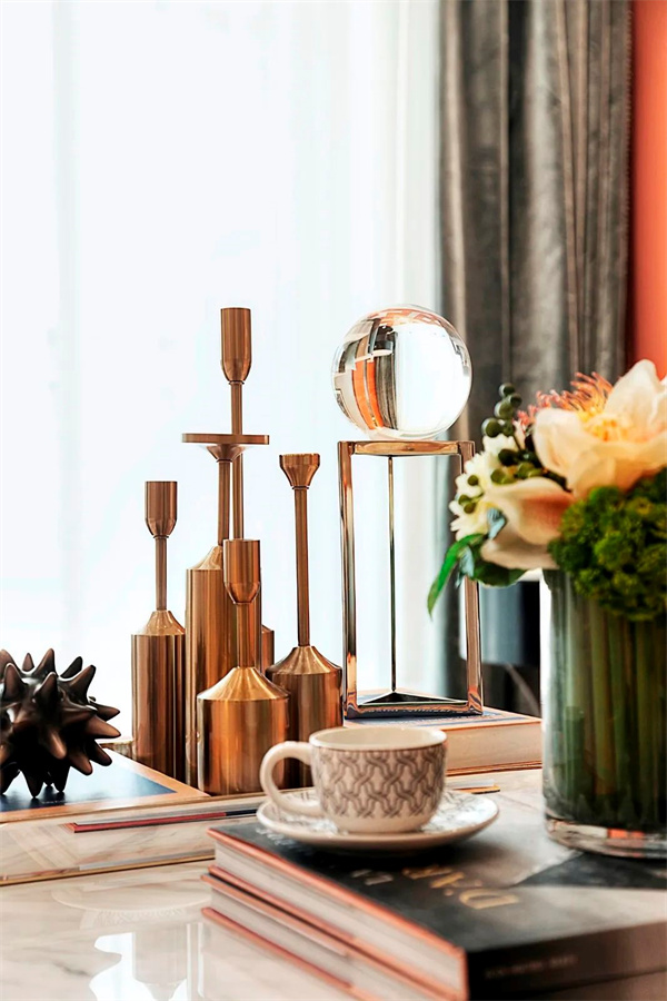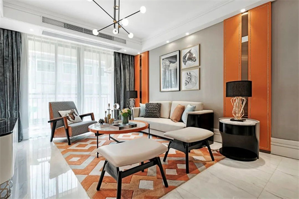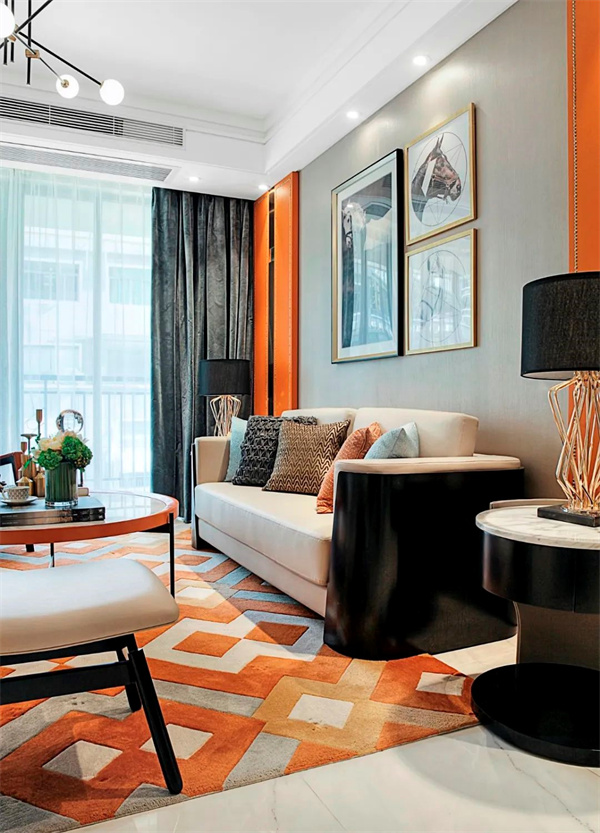 客廳的設計完美詮釋了法式輕奢的精髓,一張極具視覺沖擊力的愛馬仕橙色地毯鋪陳于大理石地面上,與淺米色的沙發(fā)和金屬質(zhì)感的茶幾形成鮮明對比,營造出層次分明的視覺效果。柔和的燈光與古典裝飾掛畫,為整個空間增添了一份溫暖的浪漫氛圍。