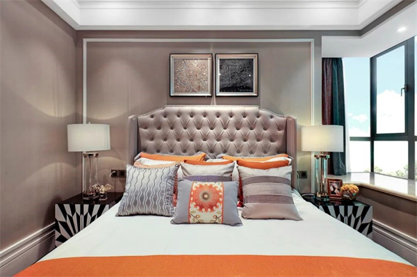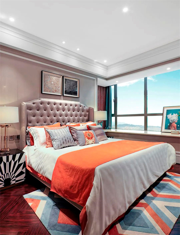 主臥中,優(yōu)雅與奢華交織成了一幅夢幻的畫卷。床頭采用軟包設計,柔軟的天鵝絨床品與大飄窗相互呼應,在燈光下散發(fā)出溫暖的光澤。金屬邊框的鏡子與床頭柜上簡約的臺燈為臥室增添了一絲現(xiàn)代感,同時保持輕奢的調(diào)性,使空間既舒適又不失格調(diào)。