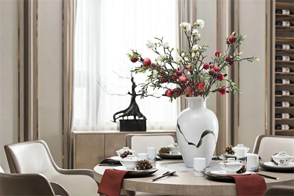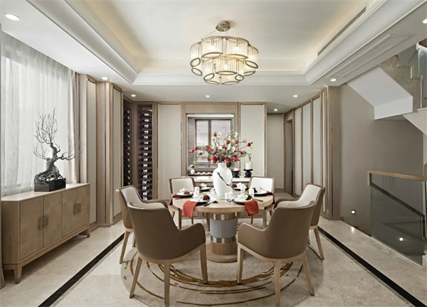 餐廳的餐桌椅采用雙拼色設(shè)計,融合傳統(tǒng)工藝與現(xiàn)代簡約線條,獨具匠心。餐桌中央擺放著新鮮的花卉,為空間增添生機與色彩。頂部懸掛著精美吊燈,柔和的燈光灑在餐桌上,營造出溫馨的用餐氛圍。