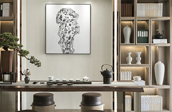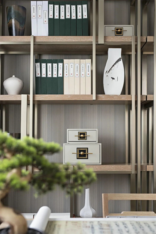 書桌和書柜是書房的核心裝置,沉穩(wěn)的木質(zhì)書桌與原木書柜展示了東方文化的深厚底蘊。書桌上的文房四寶、書柜上的古典書畫和瓷器,既點綴了空間又表達(dá)了主人對傳統(tǒng)文化的熱愛。