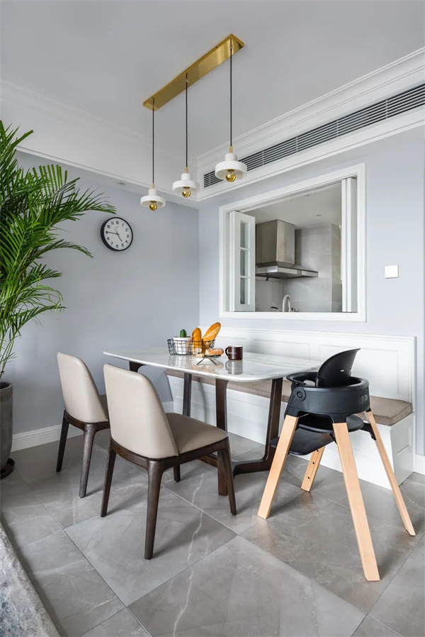 餐廳以簡(jiǎn)約的餐桌和現(xiàn)代餐椅為特色,簡(jiǎn)約布置創(chuàng)造一個(gè)純凈的用餐環(huán)境。餐桌上方懸掛著一組金屬吊燈,柔和光影灑落在餐桌上,營(yíng)造出溫馨的用餐氛圍,讓人感受到現(xiàn)代風(fēng)格的精致與品味。