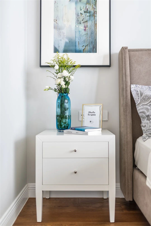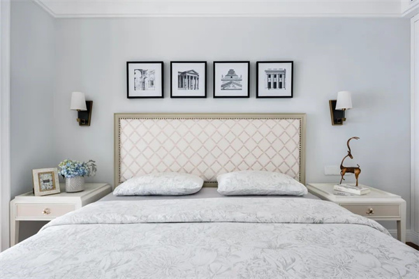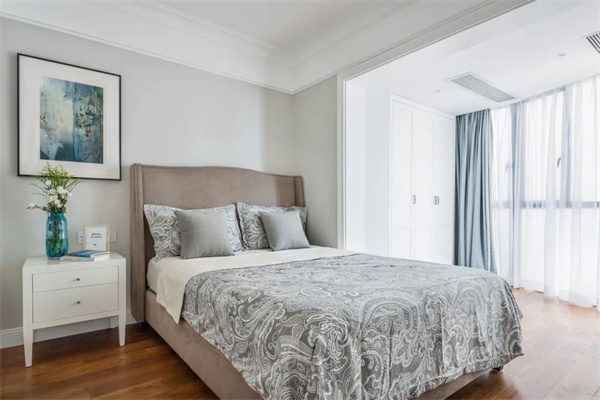 次臥延續(xù)了黑白灰的主色調(diào),柔和的光線為房間注入了一絲溫暖。簡(jiǎn)潔的床頭背景墻上做了裝飾畫設(shè)計(jì),與房間的整體氛圍完美契合,增添了一抹藝術(shù)氣息。