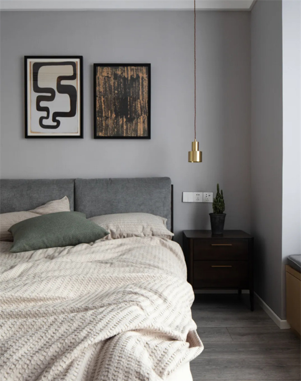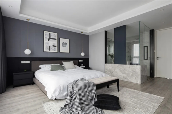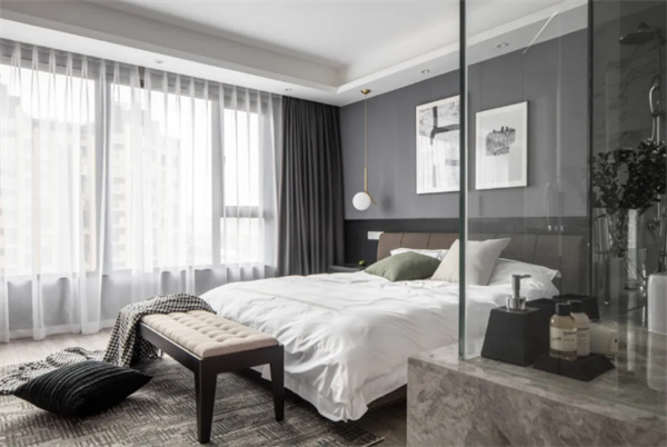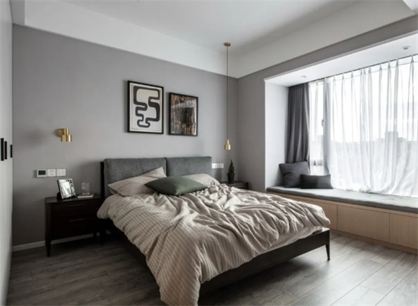主臥室以灰色為主,地板+墻面、包括床上用品,都采用了白色和灰色的組合。床頭柜和背景是黑+灰組合,為空間增添了一些深色元素。窗簾選用了白色透明面料,確保充足的自然光線進(jìn)入房間。
