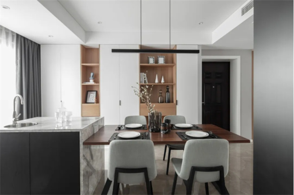 餐廳采用了原木色餐桌和現(xiàn)代風(fēng)格的椅子,椅背采用灰色織物,為用餐區(qū)增添了舒適感。頂部懸掛著精致的吊燈,為用餐區(qū)提供柔和的照明。餐邊柜裝飾著一些抽象藝術(shù)作品,為空間增添了一抹現(xiàn)代感。
