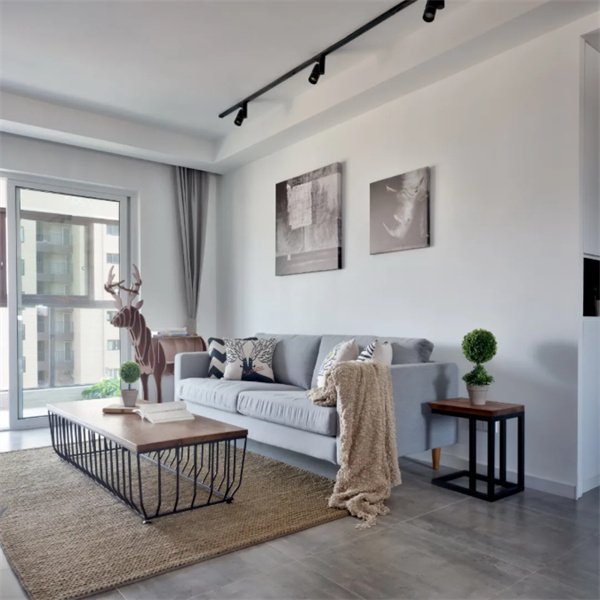 客廳整體采用了白色墻壁,使整個(gè)空間更加明亮和開(kāi)放。灰色地磚增加了室內(nèi)的深度和溫暖感。家具采用原木色,強(qiáng)調(diào)自然元素。舒適的灰色沙發(fā)和裝飾枕頭為客廳增添了溫馨感。墻上的裝飾物和藝術(shù)品展示著北歐設(shè)計(jì)的獨(dú)特元素,為空間增添了個(gè)性。