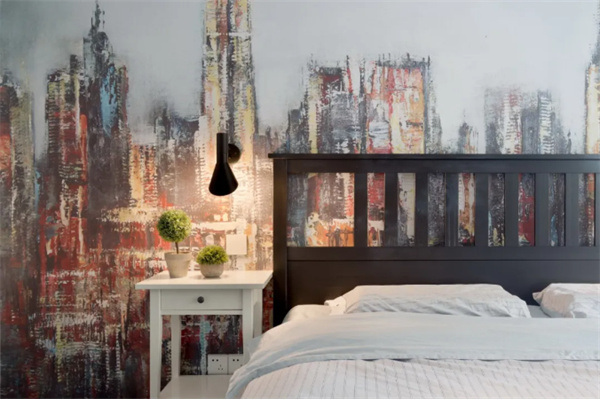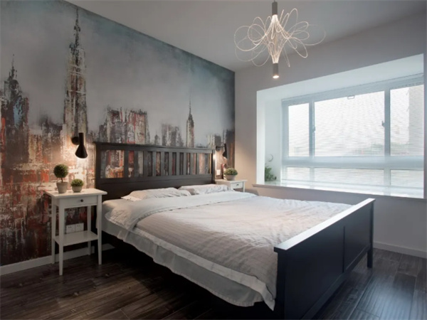 主臥室以白色墻面為主,床頭背景墻繪制大幅藝術(shù)畫(huà),為空間增添藝術(shù)氣息。大窗戶(hù)帶來(lái)了足夠的自然光線,使臥室更加明亮。簡(jiǎn)約的原木床加上深色地板與白色飄窗臺(tái),簡(jiǎn)簡(jiǎn)單單的空間,充滿了輕松與自然的質(zhì)感。