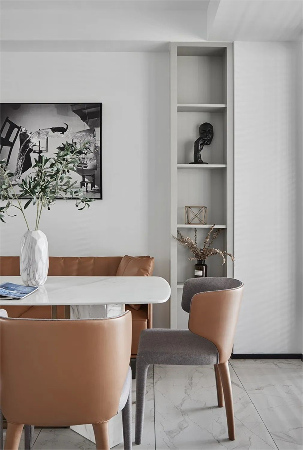 餐廳延續(xù)了客廳的風(fēng)格,餐邊置物架與沙發(fā)搭配,將美觀與實(shí)用性發(fā)揮得淋漓盡致。精致的燈具設(shè)計(jì),將溫暖的光線投射到大理石餐桌和皮藝餐椅上,營(yíng)造出舒適的用餐氛圍。
