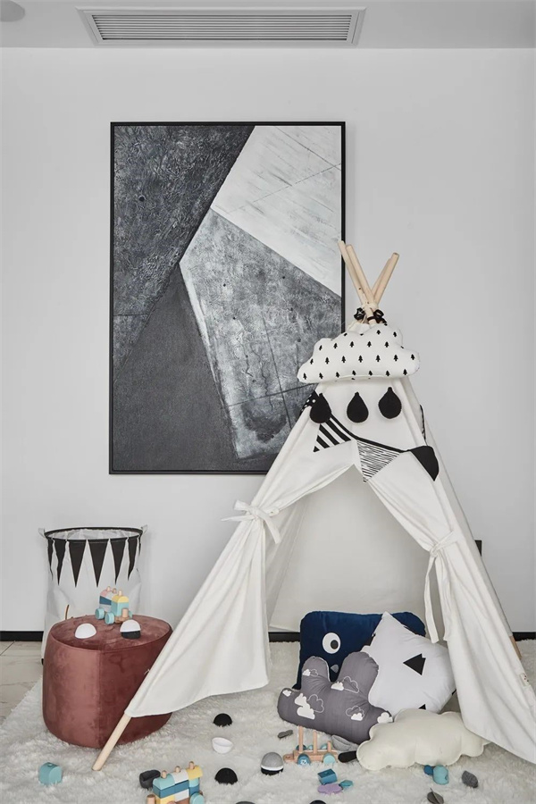 本案為孩子打造一個(gè)專(zhuān)屬的“童夢(mèng)樂(lè)園”,小帳篷角落、攀爬墻與讀書(shū)區(qū)巧妙融合,讓孩子在嬉戲中釋放天性,也能在靜謐中感受成長(zhǎng)的樂(lè)趣。地面采用柔軟環(huán)保的材質(zhì)搭配,讓每一步都安心,每一次跌倒都安全無(wú)虞。