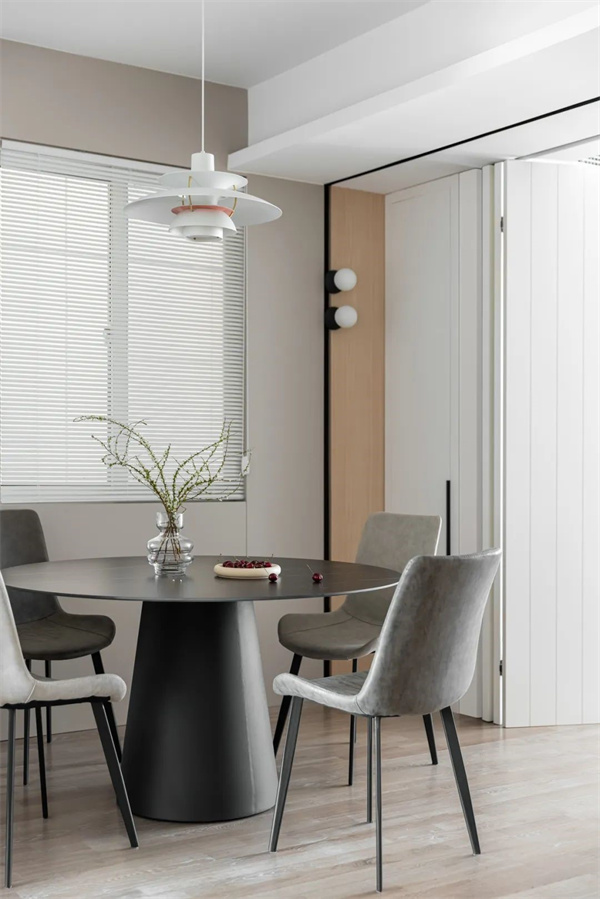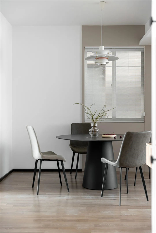 餐廳與客廳相連,采用了開放式布局。這個設計充滿層次感,也起到了引導公共空間的視覺效果。以餐桌為中心,打造了流動而舒適的空間布局,搭配頂面吊燈,以柔和的燈光營造出舒適的用餐氛圍。