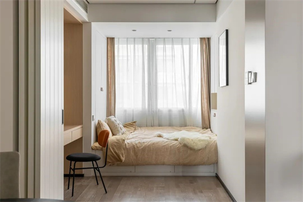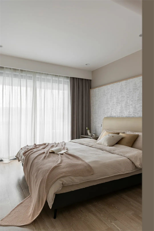 臥室墻面采用柔和的中性色調,搭配極簡的線條裝飾,讓人一踏入便感受到放松與安寧。簡約設計的木質床,搭配柔軟的床品,帶來舒適的睡眠體驗。床頭的壁燈與小巧的床頭柜,既注重功能性,又增添了一抹時尚的設計感。