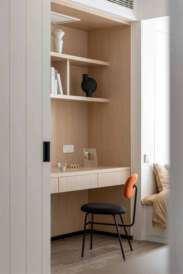 孩子房間以功能性與設計感并重,打造出一個充滿專注與創(chuàng)意的成長空間。房間整體采用明亮的中性色調,開放式書架,搭配柔和的燈光結合自然采光,保護視力的同時,讓空間更加舒適。