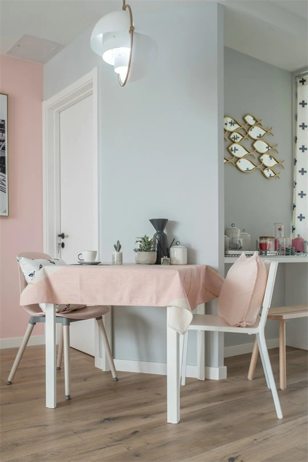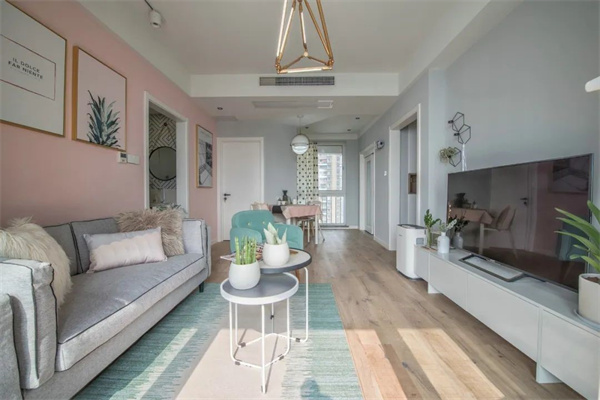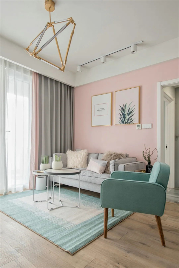 客廳墻壁采用粉色和天藍(lán)色的巧妙組合,這種色彩搭配不僅增添了空間的層次感,還帶來了一種溫暖與寧?kù)o的對(duì)比美,兩者相互映襯,營(yíng)造出一種既溫馨又清爽的視覺效果。