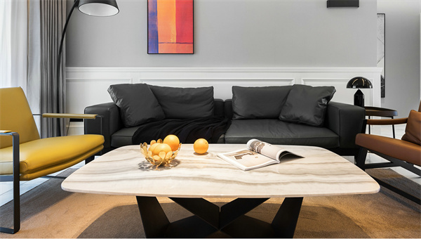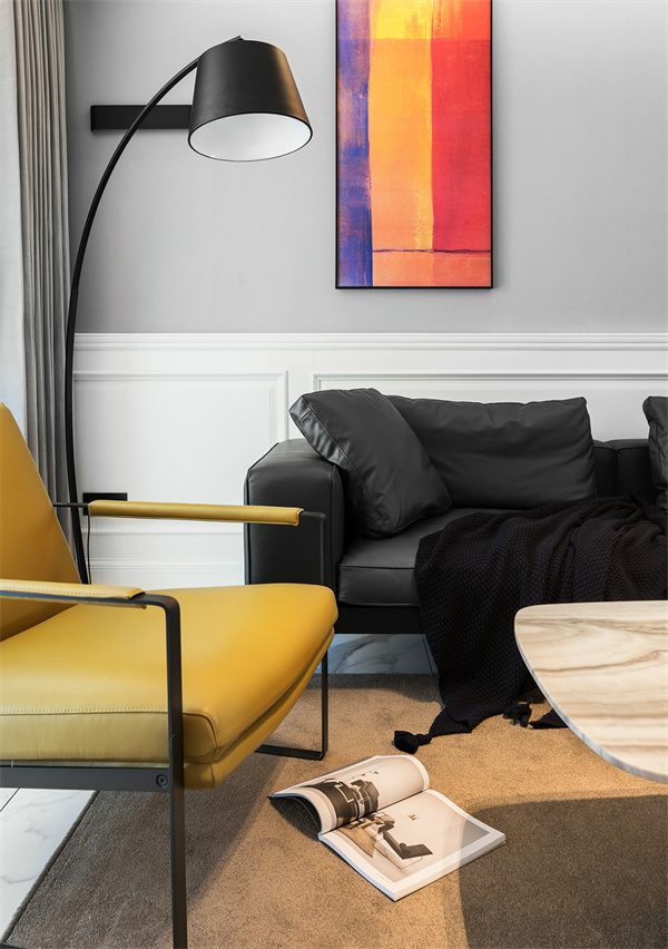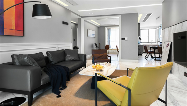 客廳主色調(diào)采用灰白墻面與白色大理石地磚搭配,創(chuàng)造出通透明亮的空間感。以低調(diào)的深色調(diào)沙發(fā)展現(xiàn)簡約品味,通過精致的極簡設(shè)計裝飾畫和空間擺件,為整個客廳注入一絲藝術(shù)氛圍。