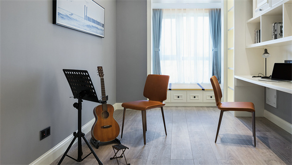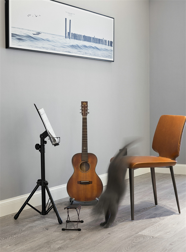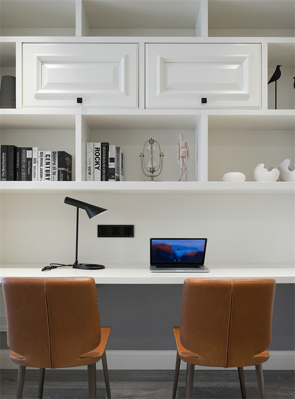 書房注重實用性和整體協(xié)調(diào)性。以純白書桌和書架組合,打造出一個明快而整潔的學(xué)習(xí)空間。舒適的椅子、明亮的臺燈,以及簡約的掛畫與樂器,讓這個空間兼具工作與休閑的功能。