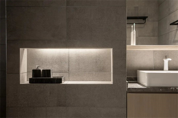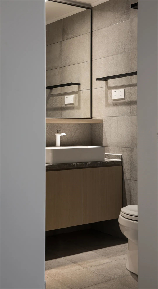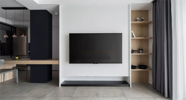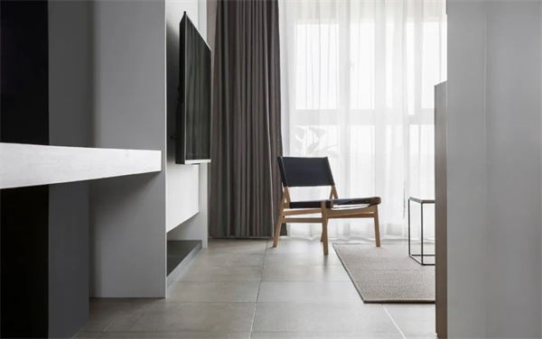 客廳設(shè)計以黑、白、灰的主色調(diào)為基礎(chǔ)淺云白的墻面營造出通透感,灰色瓷磚地面搭配原木色飾面打破單調(diào) ,賦予空間層次感。天花頂面裝上筒燈,再明裝導(dǎo)軌射燈配合灰色調(diào)軟裝布置呈現(xiàn)出一種極簡大方的空間感。