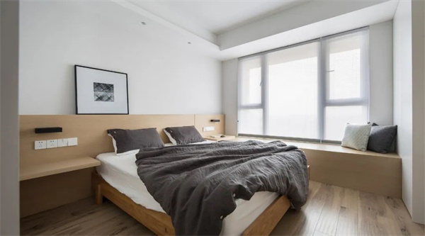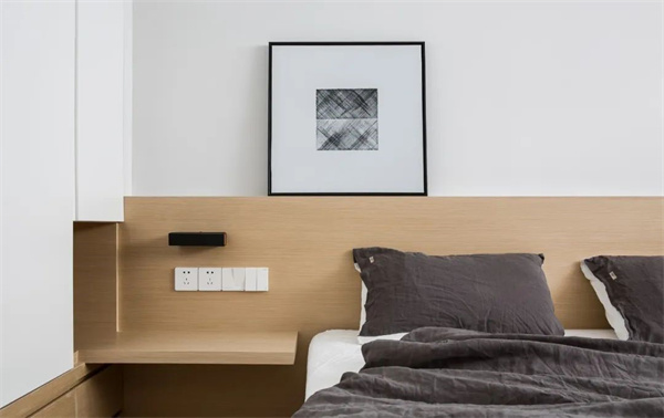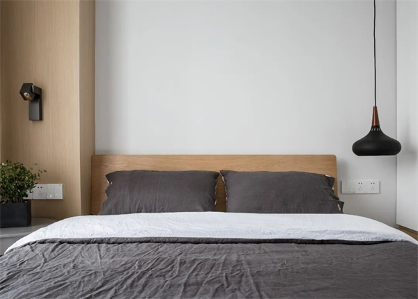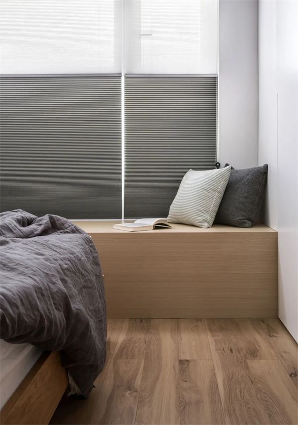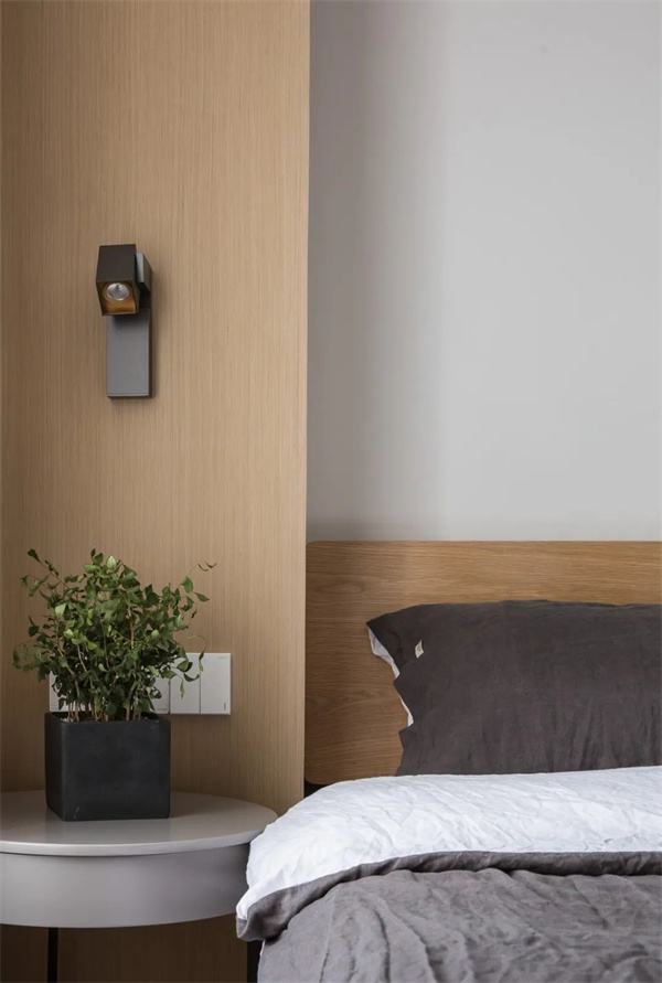 主臥空間以原木地板為基調(diào),搭配白色墻面與灰自組合的床品,打造出簡約而不失品位的氛圍。選擇原木飾面的家具,與整體設(shè)計風(fēng)格保持一致,讓主臥成為一個寧靜而舒適的私人空間。