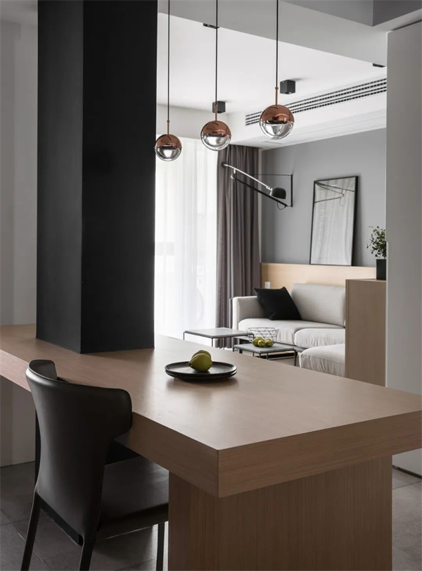 黑、白、灰的裝飾元素在餐廳中得到了精致展現(xiàn)。白色的墻面與灰色地磚組合,簡約高級的原木餐桌搭配深灰色皮質(zhì)餐椅,呈現(xiàn)出現(xiàn)代感與溫馨感的完美平衡。