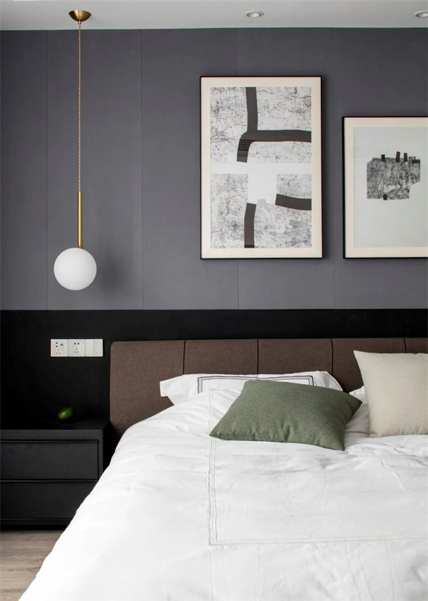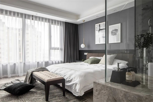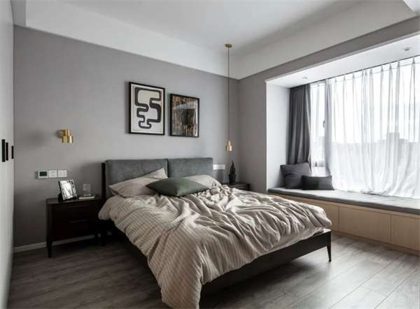 主臥室以灰色為主,地板+墻面、包括床上用品都采用了白+灰組合。床頭柜和背景的灰黑組合,為空間增添了一些深色元素。窗簾選用了白色透明面料,確保充足的自然光線進入房間。