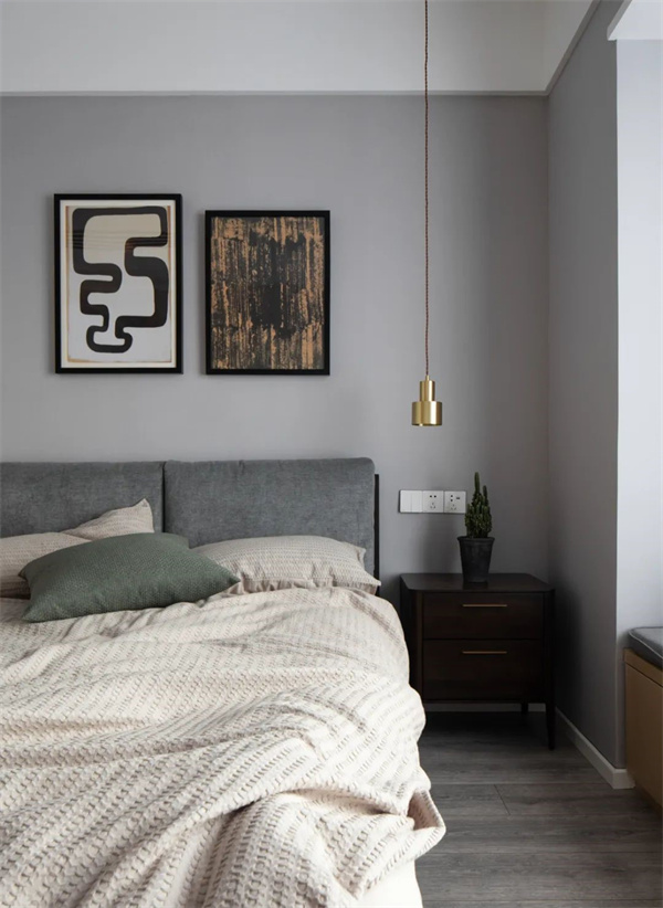 次臥延續(xù)整個住宅的黑白灰現代風格,以淡灰色為主色調,營造出寧靜的氛圍。墻面和窗簾都是白色+淡灰色組合,一張簡約而舒適的雙人床與原木床頭柜相配,增添了自然質感。