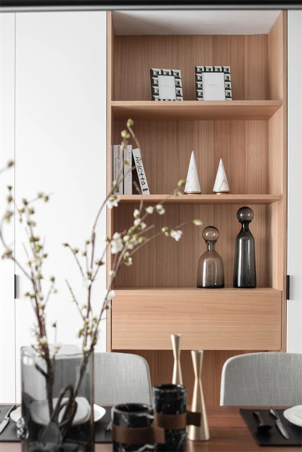 餐廳采用了原木色餐桌和現代風格的椅子,椅背采用灰色織物為用餐區(qū)增添了舒適感。頂部懸掛著精致的吊燈,為用餐區(qū)提供柔和的照明。餐邊柜裝飾著一些抽象藝術作品,為空間增添了一抹藝術感。