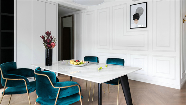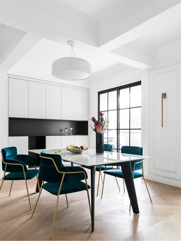 餐廳的椅子選用金屬+布藝搭配,強(qiáng)調(diào)簡約與質(zhì)感。餐具和裝飾品注重線條簡單,營造純凈的用餐環(huán)境。燈光設(shè)計(jì)簡潔而柔和,打造出寧靜而舒適的用餐氛圍,突顯生活格調(diào)。