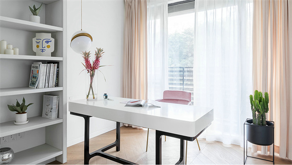 書柜與書桌延續(xù)白色主調(diào),明亮的陽光透過寬大窗戶灑在書桌上,創(chuàng)造了宜人的學(xué)習(xí)環(huán)境??臻g里擺放的綠植增添生機(jī),注入清新氛圍,為業(yè)主營造思考與學(xué)習(xí)的寧靜空間。