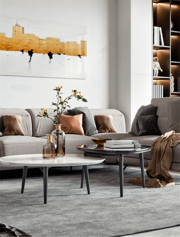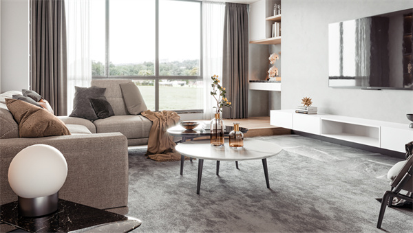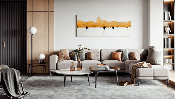 客廳的設(shè)計(jì)注重舒適和開(kāi)放感,白色墻壁和中性色調(diào)的地板創(chuàng)造了明亮的背景,大窗戶保了足夠的自然光線。舒適的沙發(fā)、柔軟的地毯和靠枕提供了宜人的休息空間,墻上掛著一些抽象藝術(shù)品,為空間增加現(xiàn)代感。