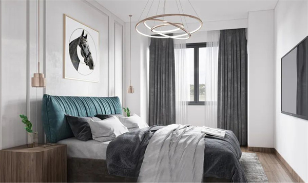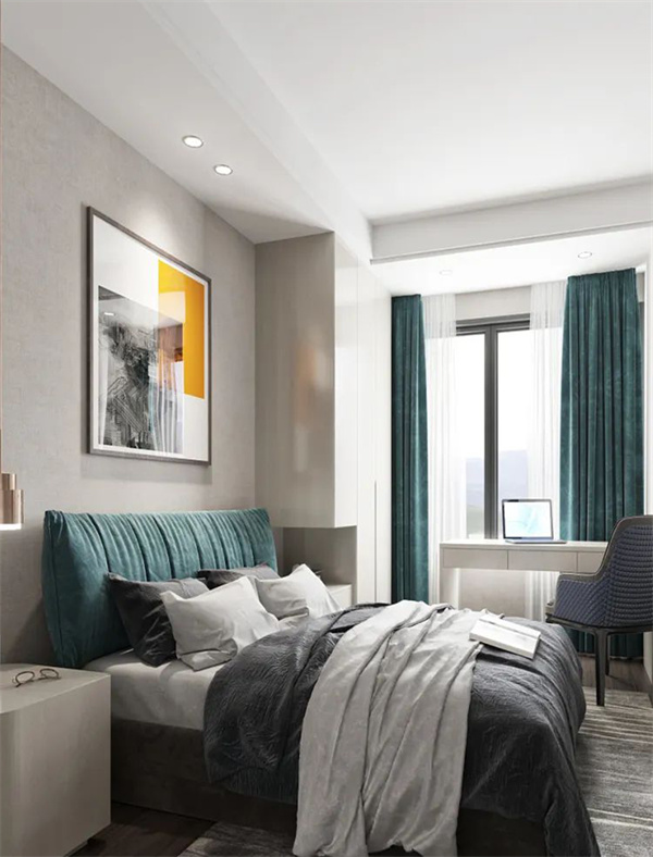 主臥室以中性色調(diào)為主,墻面白+灰組合,地板采用深色木質(zhì)元素搭配灰色床品,床頭配有現(xiàn)代質(zhì)感的收納柜,為主人提供額外的儲(chǔ)物空間。陽(yáng)光通過(guò)大大的飄窗灑入房間,為整個(gè)空間帶來(lái)了溫暖和明亮。