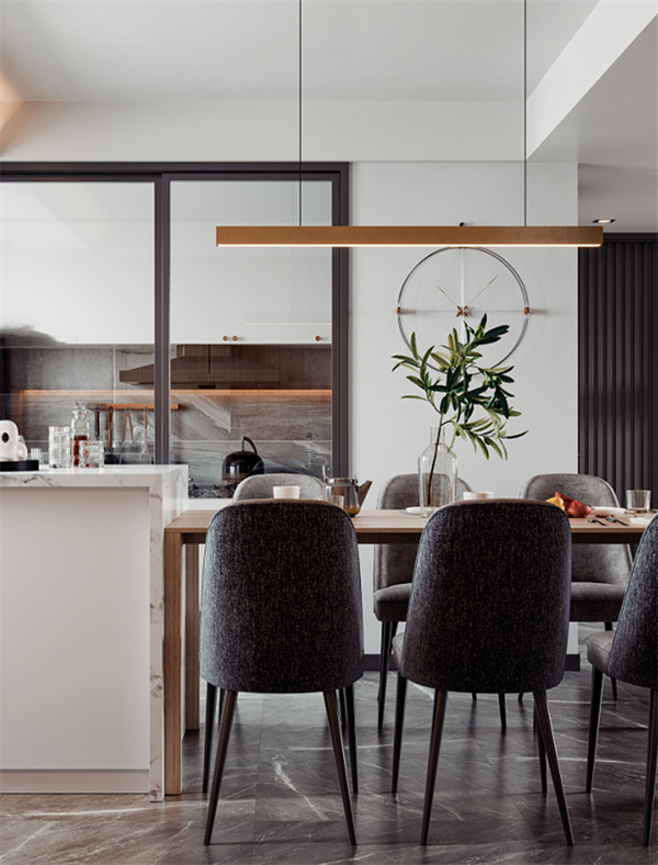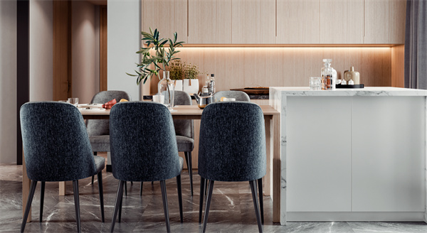 餐廳與客廳相連,采用了開(kāi)放式布局這個(gè)設(shè)計(jì)充滿層次感。島臺(tái)選用與客廳電視背景同款的大理石,作為呼應(yīng)的原木色餐桌搭配六把布藝餐椅,簡(jiǎn)潔的設(shè)計(jì),賦予餐廳簡(jiǎn)約大氣的質(zhì)感,帶來(lái)不流俗的個(gè)性格調(diào)。