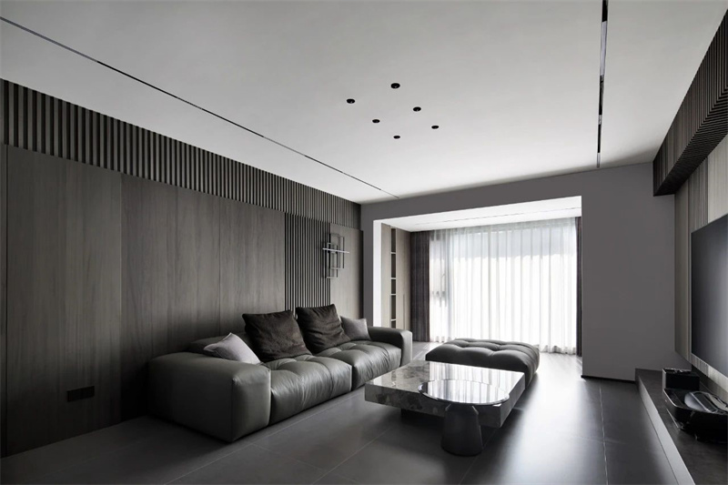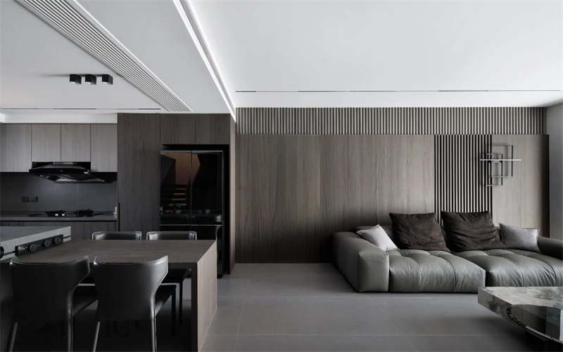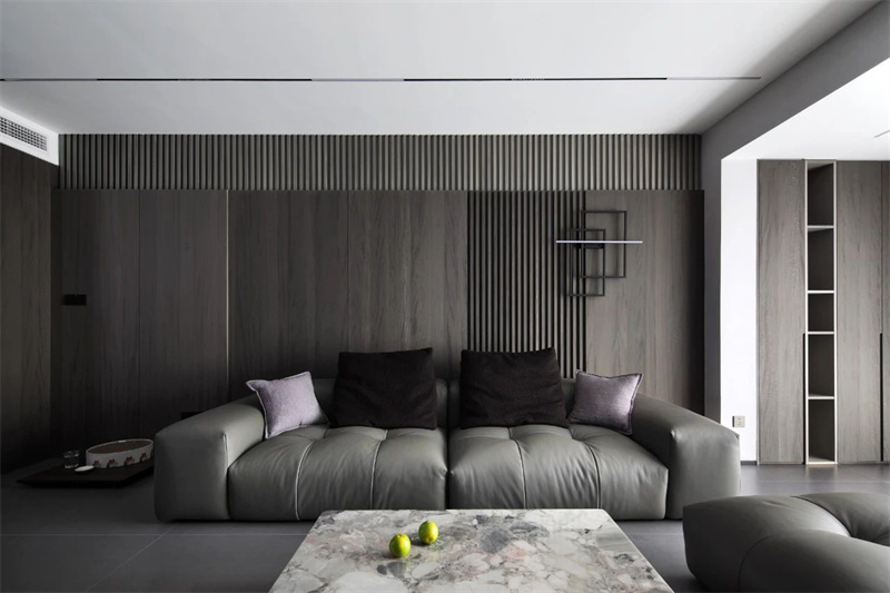 客廳以大面積的灰色調(diào)為主,搭配深色木質(zhì)墻面和地磚,展現(xiàn)出一種低調(diào)的奢華感?;疑べ|(zhì)沙發(fā)線條流暢、造型簡(jiǎn)約,既舒適又不失時(shí)尚感,成為整個(gè)空間的視覺焦點(diǎn)。大理石茶幾設(shè)計(jì)簡(jiǎn)潔大方,光滑細(xì)膩臺(tái)面反射出柔和的光澤,提升了空間的質(zhì)感與層次。