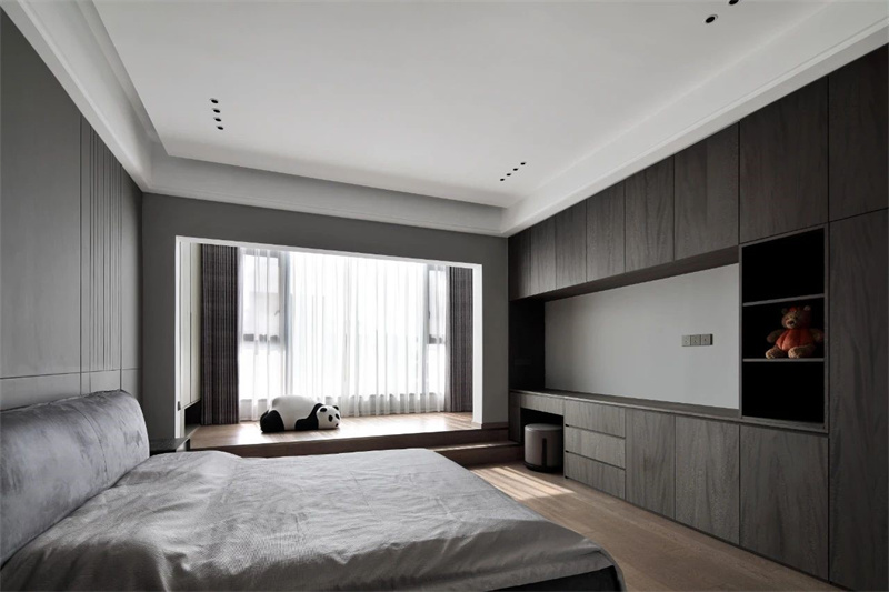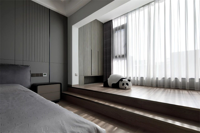 主臥以灰色和白色為主色調(diào),搭配溫暖的木質(zhì)地板,展現(xiàn)出一種低調(diào)的奢華感。床頭背景墻采用豎條紋設(shè)計(jì),增加了空間的層次感和視覺深度。飄窗設(shè)計(jì)不僅實(shí)用,還為房間增添了一處悠閑的小角落,可以在此享受陽(yáng)光、閱讀書籍或簡(jiǎn)單冥想。
