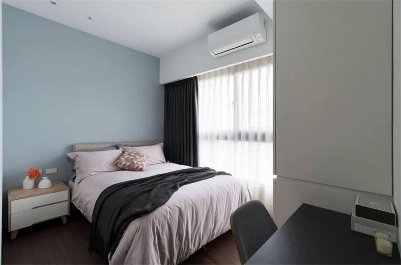 臥室床頭背景墻采用淡雅的淺藍(lán)色調(diào),營造出清新自然感。床上鋪著柔軟的粉色床品,搭配幾何圖案的抱枕和灰色毛毯,增添了幾分溫暖與舒適。床頭柜設(shè)計(jì)簡潔大方,上面擺放著幾件精致的裝飾品和一束鮮艷的橙色花朵,為整個空間注入了生機(jī)與活力。