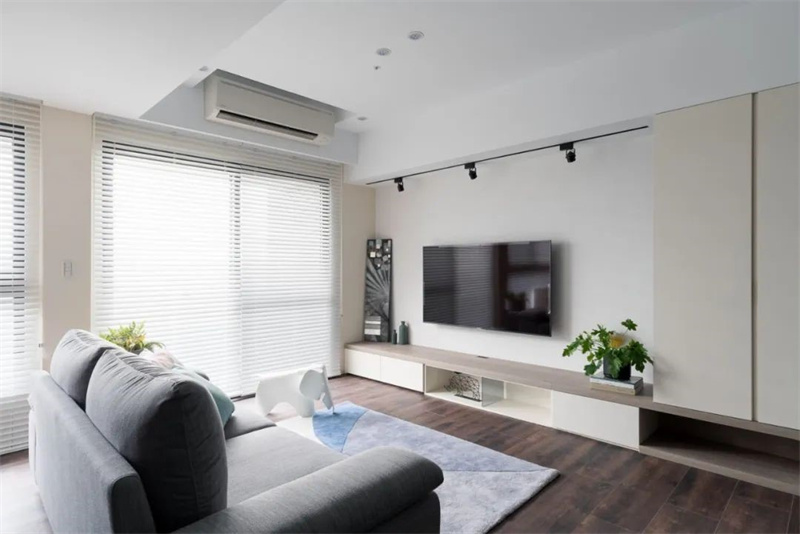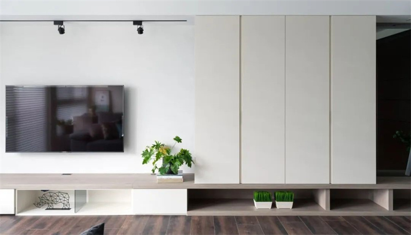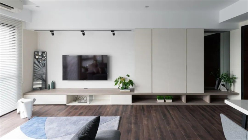 客廳以白色和淺木色為主色調(diào),搭配深色木地板,展現(xiàn)出一種清新自然的北歐風(fēng)情。大面積的白色墻面和天花板使整個空間顯得更加明亮開闊,懸掛在墻上的電視機(jī)成為視覺焦點(diǎn),下方的木質(zhì)電視柜設(shè)計(jì)簡潔大方,既實(shí)用又美觀,綠植點(diǎn)綴其間,增添了幾分藝術(shù)氣息和生機(jī)活力。