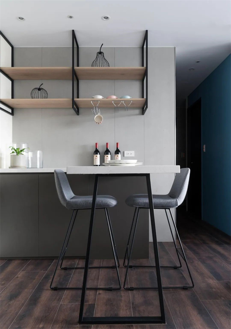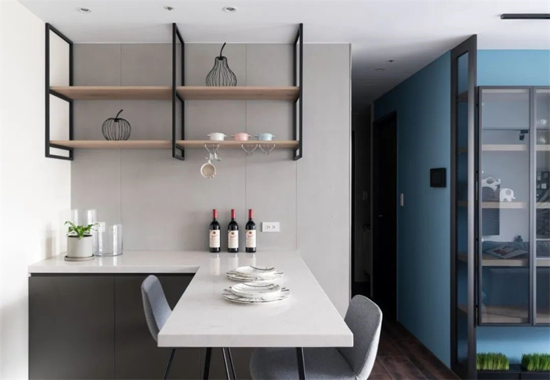 餐廳采用簡潔大方的白色大理石餐桌,搭配灰色布藝餐椅,整體色調(diào)和諧統(tǒng)一,帶來極致的用餐體驗(yàn)。餐桌上方的開放式木質(zhì)擱架設(shè)計(jì)簡約實(shí)用,不僅提供了充足的儲物空間,還成為展示個性和收藏愛好的小天地。桌面上整齊擺放的餐具和酒品,彰顯了主人對生活的精致追求。