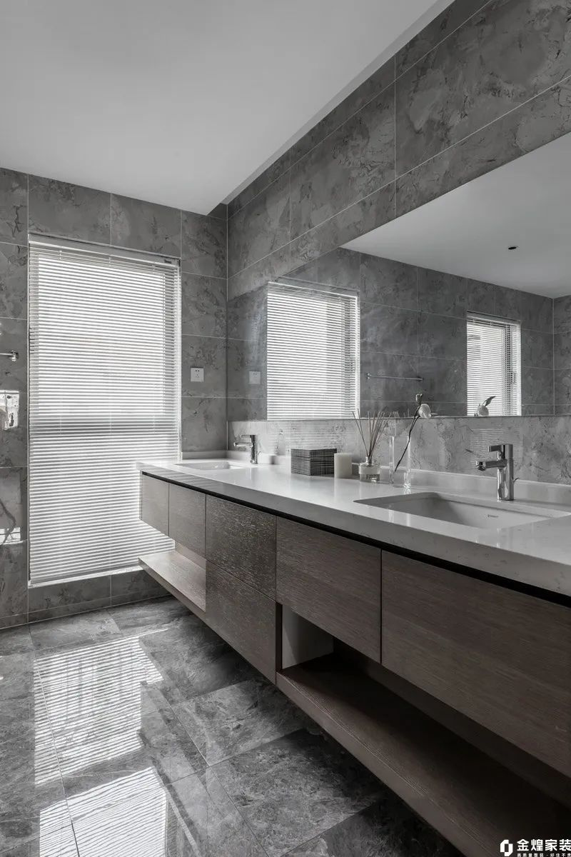 衛(wèi)生間大面積的鏡子與白色臺面組合,營造出寬敞明亮的視覺效果;懸空式洗手臺設(shè)計簡潔實用,提供了充足的儲物空間。自然光線透過百葉窗灑入室內(nèi),增添一份清新與通透感。整體設(shè)計既時尚又實用,為日常生活帶來舒適與便利。