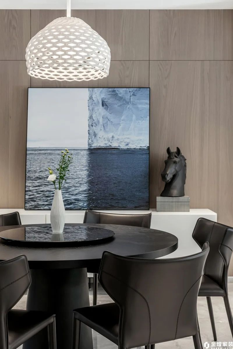 餐廳黑色餐桌椅與灰色大理石地板相得益彰,簡潔大方;木質(zhì)墻面和吊燈增添自然與溫暖感。墻上藝術(shù)畫作與雕塑擺件點綴其間,提升整體格調(diào)。無論是家庭聚餐還是朋友小聚,這里都能提供一個舒適、優(yōu)雅的氛圍。