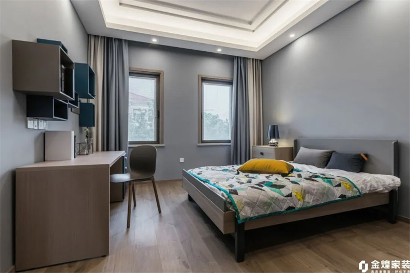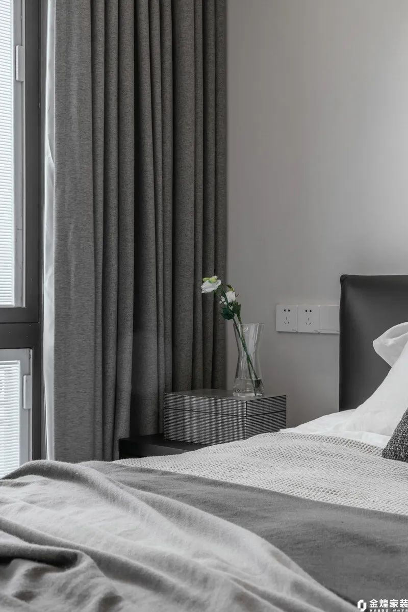 次臥延續(xù)了整個住宅的黑白灰現(xiàn)代風(fēng)格,以淡灰色為主色調(diào),營造出寧靜的氛圍。墻面和窗簾都是白色+淡灰色組合,一張簡約而舒適的雙人床與原木書桌和木色地板相配,增添了自然質(zhì)感。