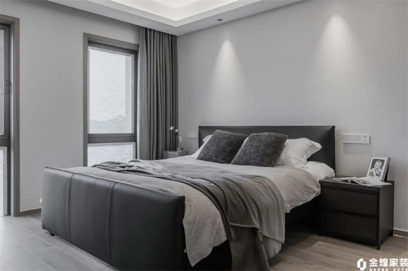 主臥室以木色地板搭配灰白墻面,包括床上用品,都采用了白色和灰色的組合,簡潔而不失質(zhì)感;大面積窗戶引入自然光線,搭配灰色窗簾,增添一份柔和與私密感。整體設(shè)計既現(xiàn)代又溫馨,是放松身心的理想之所。