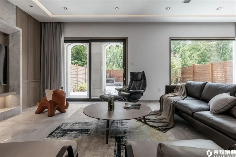 客廳墻壁和天花板都采用了純白色裝飾,營造出了通透的感覺?;疑妓嚿嘲l(fā)柔軟舒適,搭配黑色皮質(zhì)單人椅和腳凳,形成鮮明的色彩對比,讓整個空間顯得更加生動有趣。大理石電視背景墻簡潔大方,線條流暢,與整體風(fēng)格完美融合。