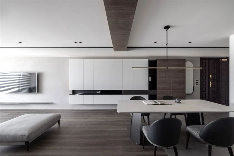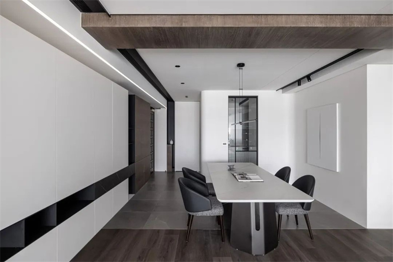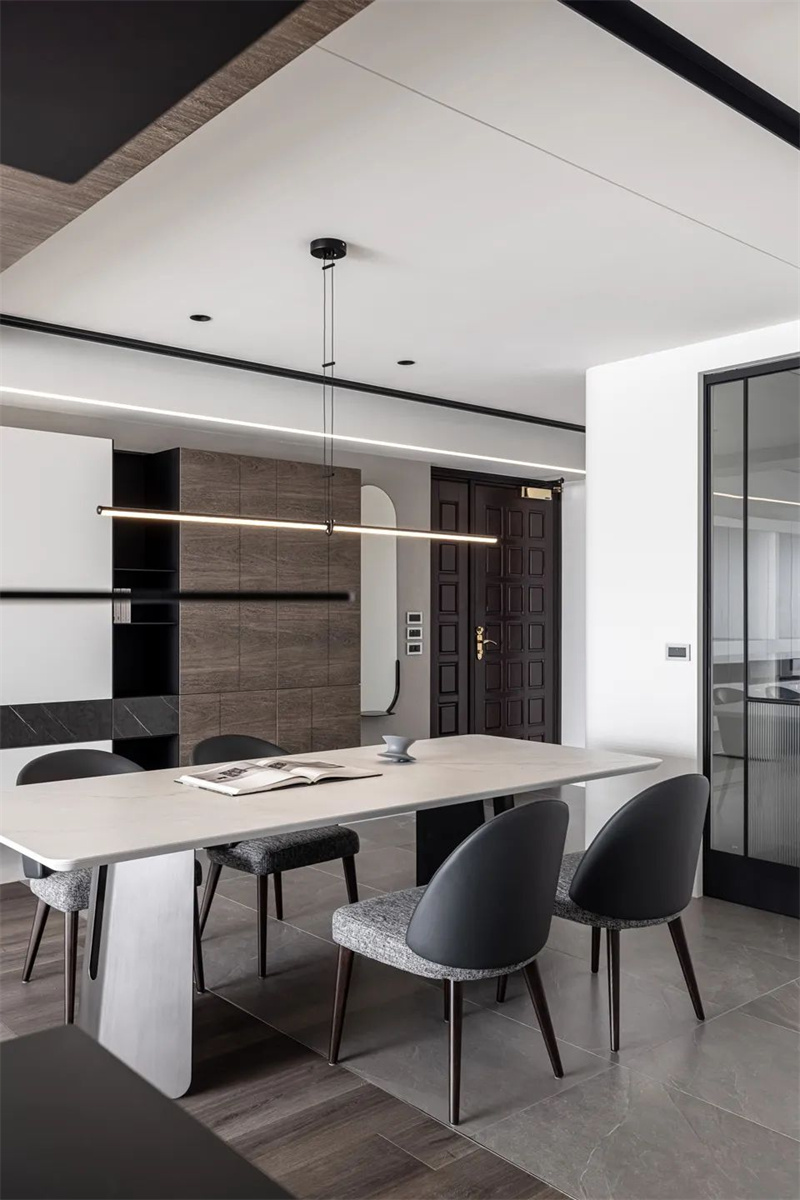 餐廳以簡約的餐桌和現(xiàn)代餐椅為特色,白色墻壁和深色的定制柜創(chuàng)造了一個純凈的用餐環(huán)境。餐桌上方懸掛著一盞簡約的金屬吊燈,柔和光影灑落在餐桌上,營造出溫馨的用餐氛圍,讓人感受到現(xiàn)代風格的精致與高雅。