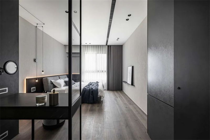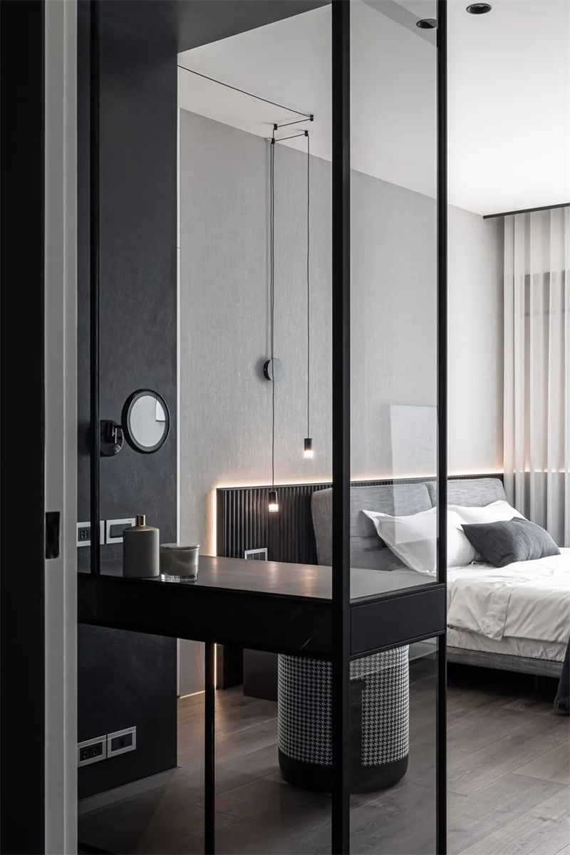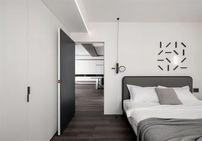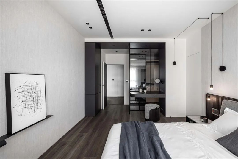 次臥延續(xù)了黑白灰的主色調(diào),床頭一側(cè)的黑色幾何吊燈,以簡約的設(shè)計凸顯現(xiàn)代感,柔和的光線為房間注入了一絲溫暖。簡潔的床頭背景墻上做了抽象裝飾設(shè)計,與房間的整體氛圍完美契合,增添了一抹藝術(shù)氣息。