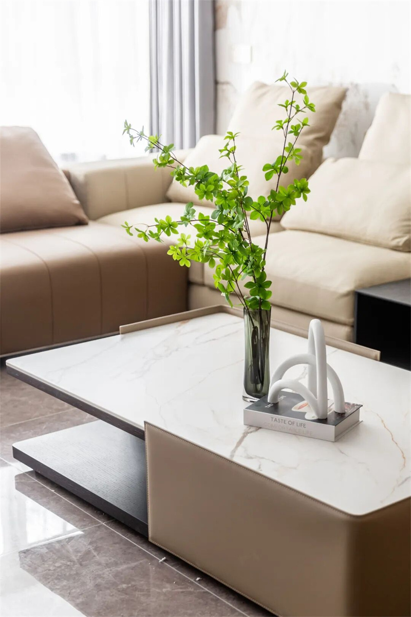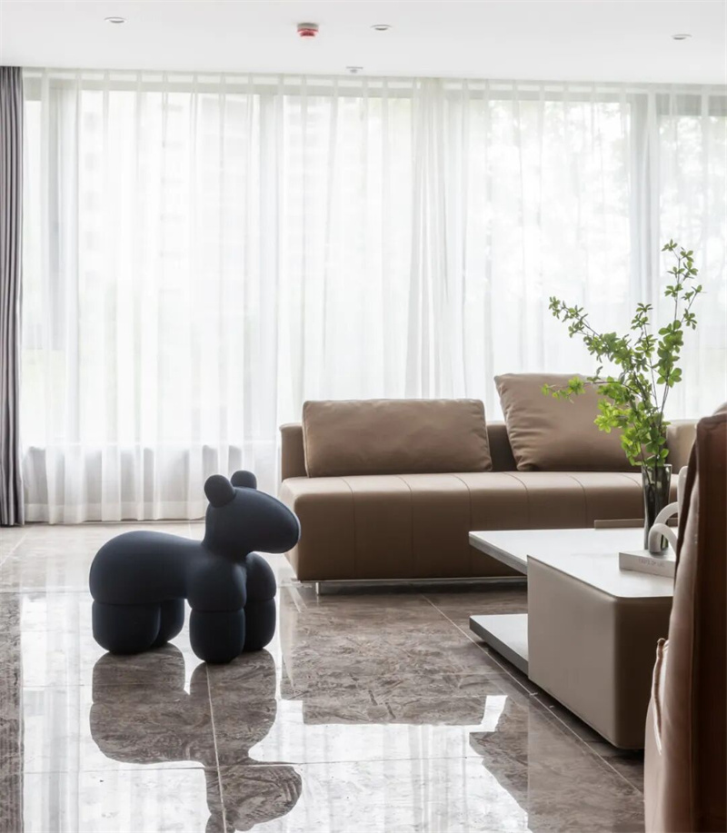 客廳擁有優(yōu)秀的采光條件,設計師選擇輕薄的窗簾布料,以確保陽光可以自由地灑進室內,最大限度地引入自然光線。這樣的設計不僅增加了室內的明亮度,還讓客廳與室外景色相融合,營造出一種開放和通透的感覺。
