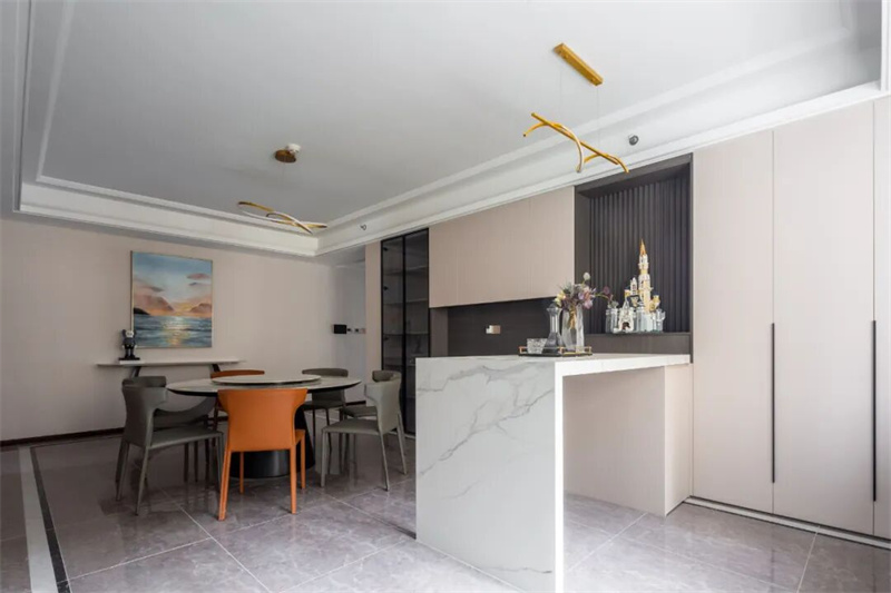 餐廳使用深色餐桌椅,搭配簡約而現代的餐具,以及柔和的暖色調燈光,這樣的布置使整個餐廳看起來簡潔而雅致,創(chuàng)造出一個優(yōu)雅而舒適的就餐環(huán)境,讓人沉浸在美食和交流的愉悅氛圍中。